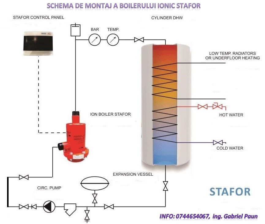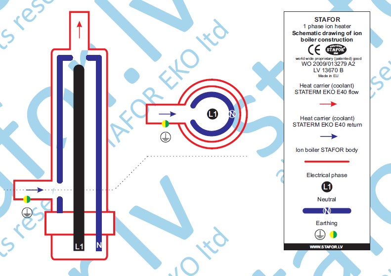 Cum funcționează? În desenul atașat veți vedea o secțiune prin aparatul care funcționează alimentat la curent monofazat – 220~230 Volți L1 – faza si N – nul. Săgeata albastră arată pe unde intră lichidul rece, iar săgeata roșie indică ieșirea lichidului cald. Temperatura de ieșire poate fi selectată în automatizarea care însoțește încălzitorul ionic. Prin încălzitor, circulă un lichid asemănător antigelului de la mașină, care va transfera căldura primită de la aparat direct în radiatoare, unui boiler(printr-o serpentină) sau într-un schimbător de căldura(instant). Atât boilerul cat și schimbătorul de căldură se găsesc în magazinele de bricolaj sau in magazinele de instalații.